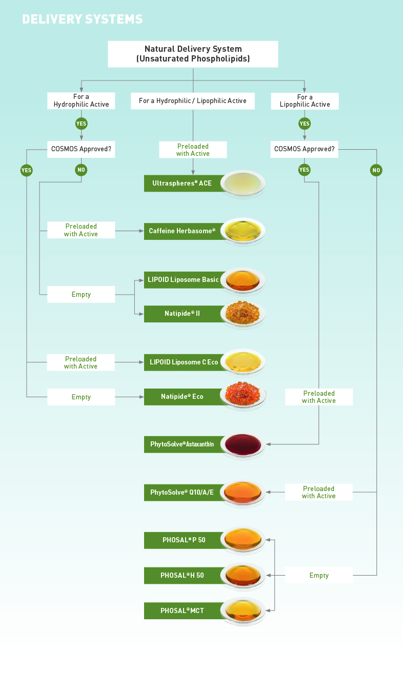 Für hydrophile Wirkstoffe empfehlen wir unser LIPOID-Liposomensortiment (vorbeladene Trägersysteme) oder unsere Natipide® -Reihe (leere Trägersysteme). Für lipophile Wirkstoffe verwenden Sie unsere PhytoSolve® -Technologie (vorbeladene Trägersysteme) oder unsere PHOSAL® -Reihe (leere Trägersysteme). Für eine Kombination von hydrophilen UND lipophilen Wirkstoffen greifen Sie bitte auf unsereUltraspheres® -Produkte zurück.